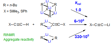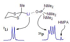 The majority of C-C bond forming reactions involve the interaction of carbanionic centers with electrophilic carbon species. Organolithium reagents are probably the single most important source of carbanionic species, and they have long played an important role in synthetic organic chemistry. A vast literature provides many recipes for preparing and utilizing them. However, the basis for much of what we do in the laboratory when we use lithium reagents is empirical, and is not based on firm mechanistic and structural insights. We are trying to understand in detail some reactions and properties of organolithium reagents. Coordinating solvents and co-solvents such as THF, TMEDA, HMPA, crown ethers and others play important roles for fine tuning the reactivity of organolithium reagents: stereochemical and regiochemical selectivity is profoundly affected by such additives, but we do not understand the origin of these changes. We have developed NMR spectroscopic tools for gaining detailed insights into the structures of lithium reagents in solution. When such studies are combined with reactivity and kinetic studies, we anticipate that organolithium reactions can be understood at the molecular level. This work has led to the discovery of new anionic complexes of organometalloids (e.g., Ph2I-Li+, Ph3Te-Li+, Me5Sn-Li+) which are intermediates in the metal-halogen exchange and transmetallation reactions, and which may behave as carbanion donors in their own right under some conditions.